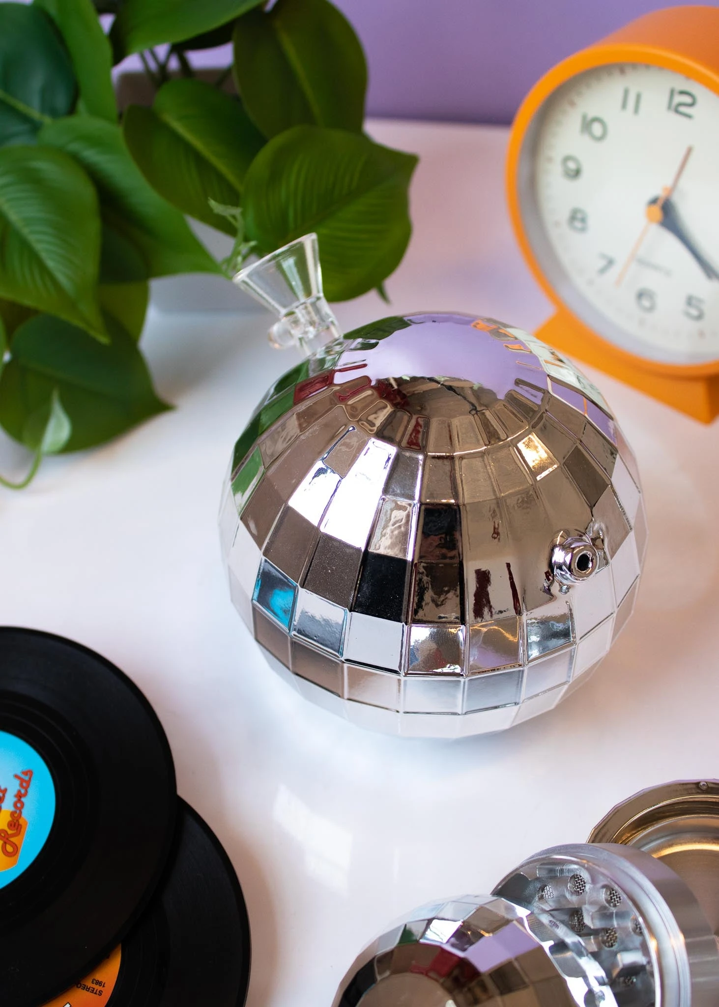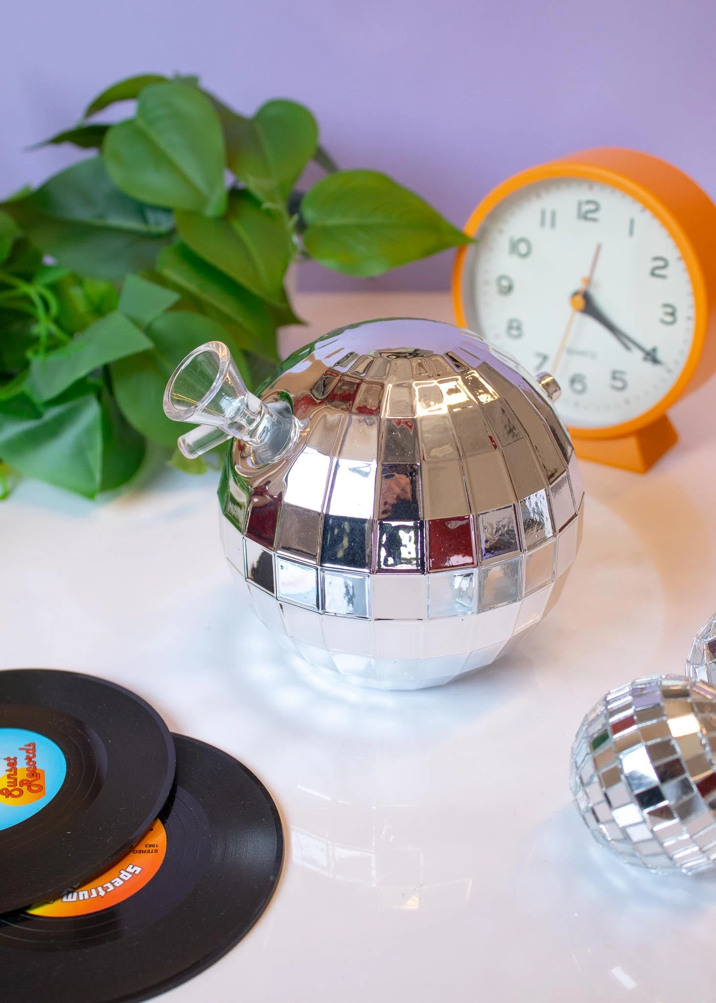 - Designed with intention. This bong is made from molded glass. The exterior is wrapped with a shiny silver coating, giving you the most realistic disco-ball look without using actual mirrors that chip or cut your skin