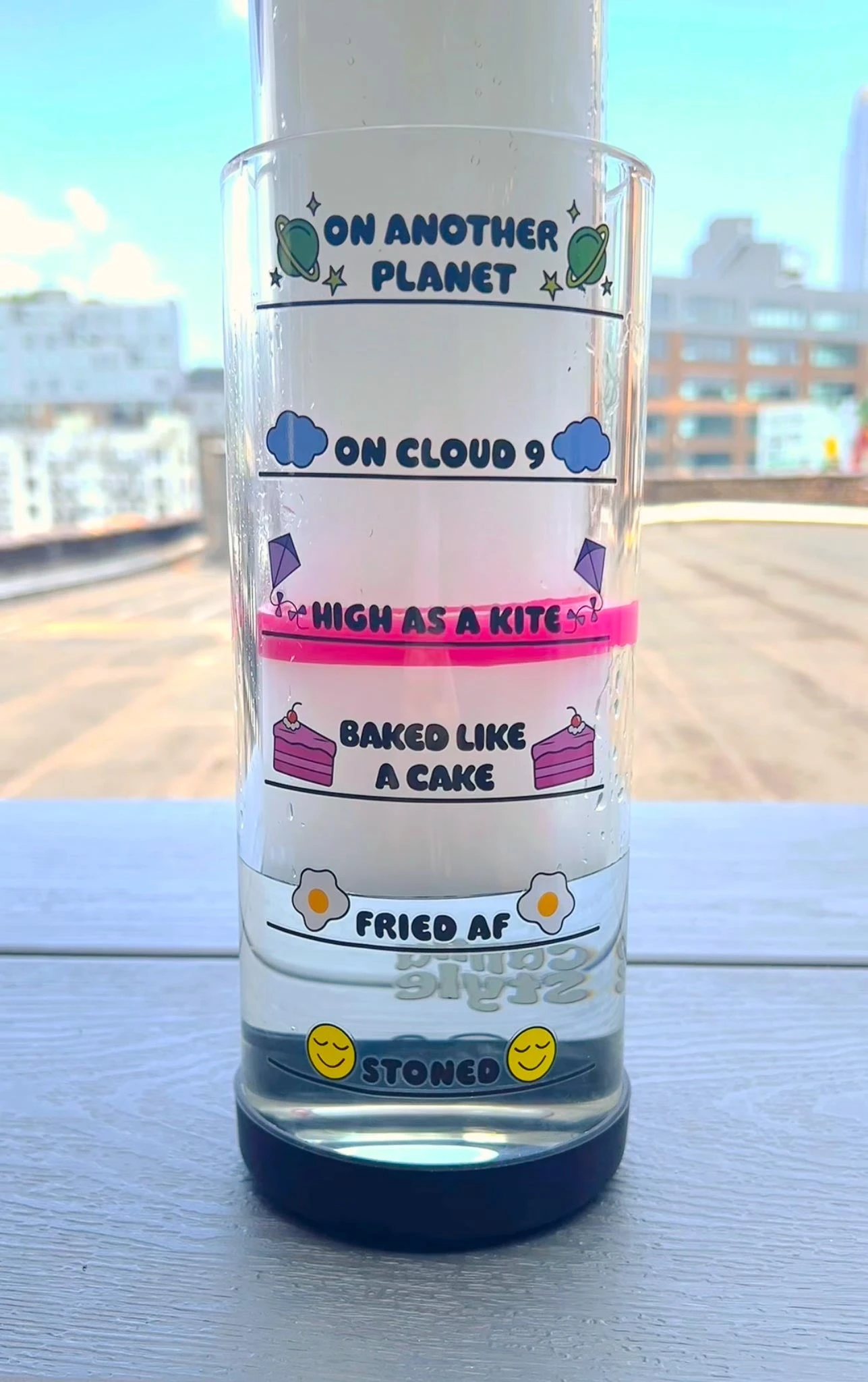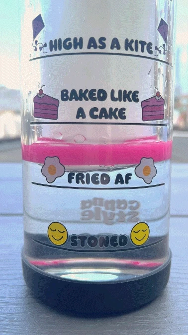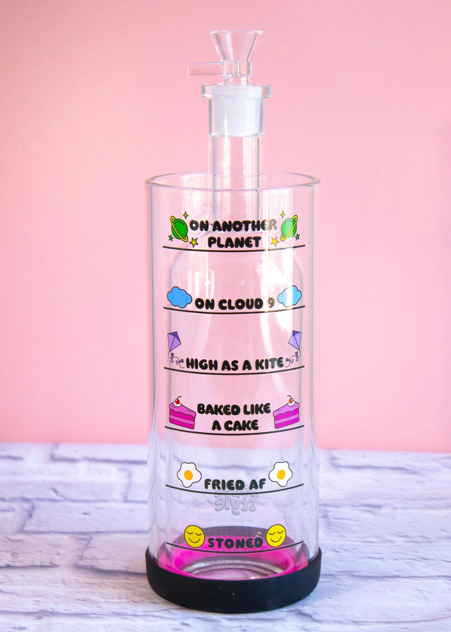 - This bong features our custom “how high will you get” indicator print. As you pull up the inner bottle, a hot pink ring moves up each level to indicate how high you will get