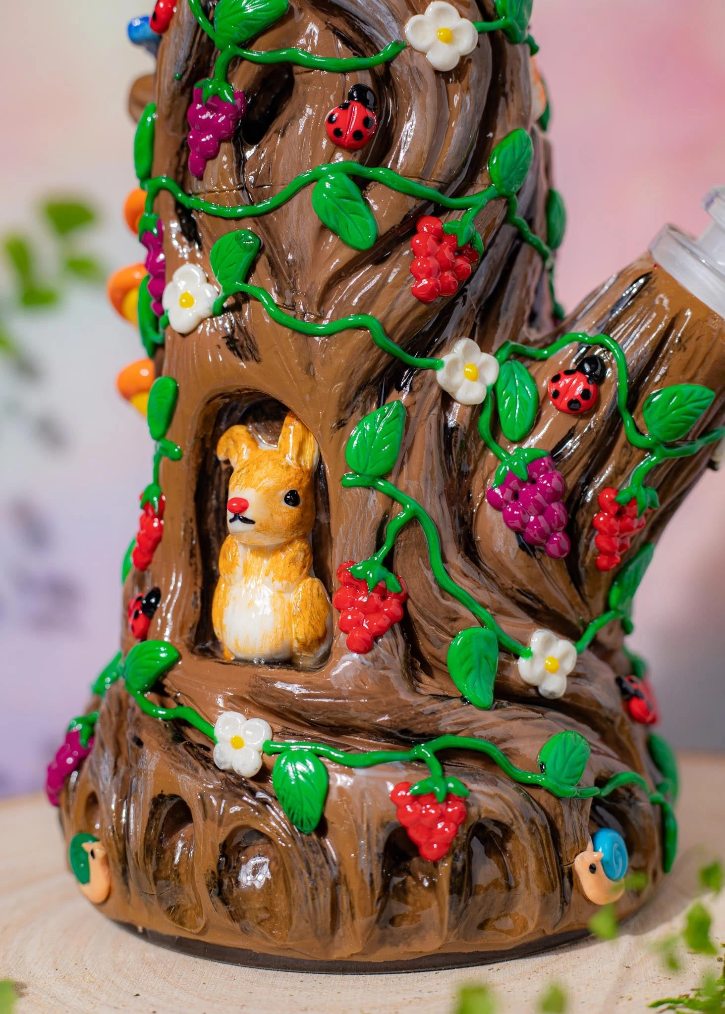 - This handcrafted bong features adorable woodland creatures nesting in a tree trunk, including a bunny, deer, squirrels & birds